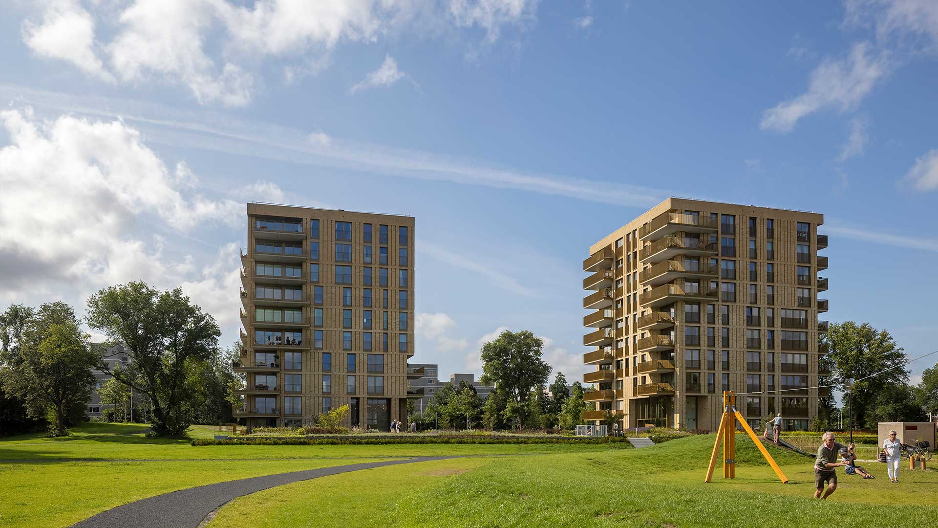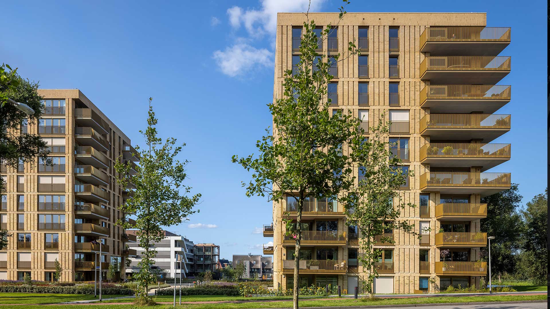 Het ontwerp heeft een chique uitstraling met een stoere bakstenen gevel, waarin goudkleurige kozijnen speels variëren in positie per verdieping. De grote balkons, deels uitkragend, zorgen voor veel buitenruimte en garanderen een bijzonder uitzicht voor elk appartement.